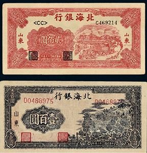 在抗戰(zhàn)勝利結(jié)束時(shí),山東解放區(qū)已有極大發(fā)展,有12.5萬平方公里的面積,占山東總面積的92%,擁有2400萬人口,占山東總?cè)丝诘?0%。1948年10月,山東的北海銀行幣與華北的冀南銀行幣、晉察冀邊區(qū)幣固定比價(jià)互相流通,1948年11月16日起,北海銀行幣與華中銀行幣等價(jià)流通。這一時(shí)期的北海銀行幣均不加蓋地名,便于山東以外的地區(qū)流通。1948年12月1日,華北銀行、北海銀行、西北農(nóng)民銀行合并,在石家莊成立中國(guó)人民銀行,但因工作的需要,北海銀行繼續(xù)營(yíng)業(yè),1949年1月底開始回收北海銀行幣,同年11月1日改稱中國(guó)人民銀行山東分行,至此,北海銀行完成了它的歷史使命宣告結(jié)束。